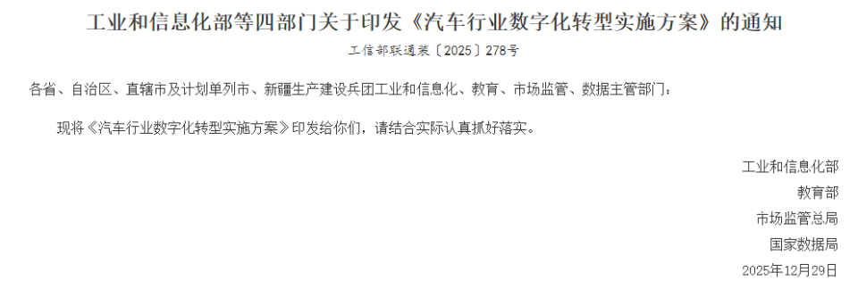 汽车产业是国民经济的重要支柱产业,产业链长、涉及面广、关联带动性强,是制造业数字化转型的重点领域。近年来,我国汽车行业数字化转型持续深化,加速向数字化、网络化、智能化演进,但仍存在顶层设计不足、数据要素应用不充分、零部件中小企业转型较慢等问题。为落实《制造业数字化转型行动方案》,推动汽车行业数字化转型、智能化升级,快速推进新型工业化,培育形成新质生产力,制定本实施方案。