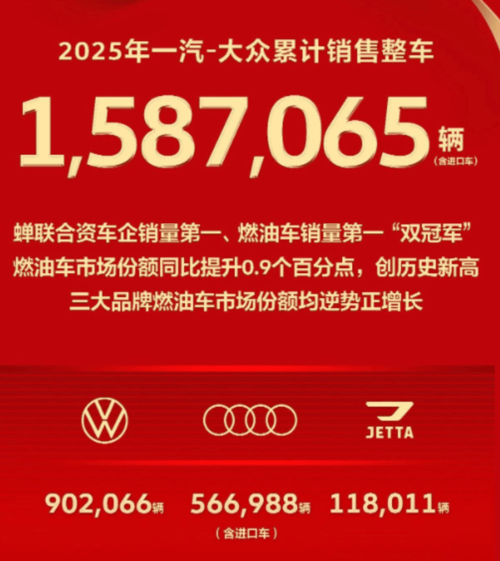 以大众为例,一汽大众发布了25年的销量海报,大众本品牌销量超90万,一汽奥迪销量超56万,捷达销量接近12万。